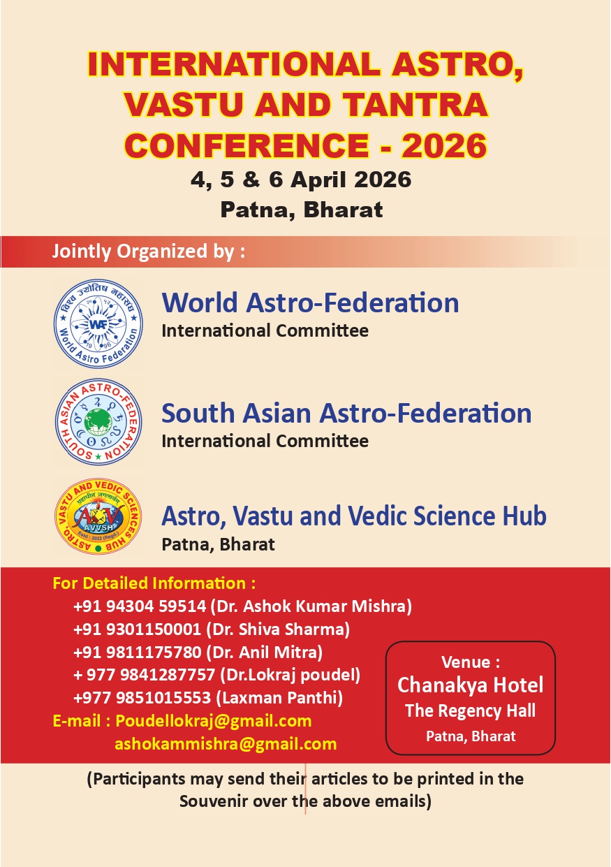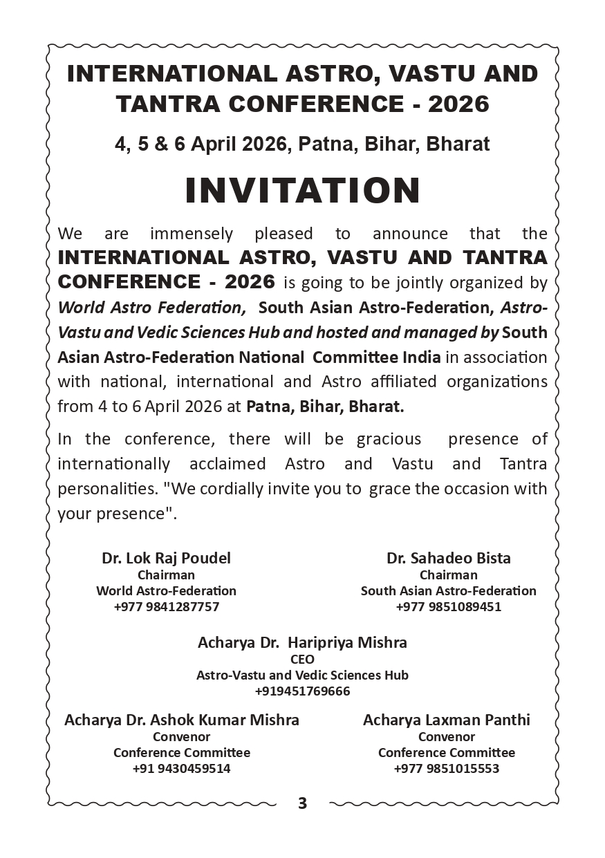 विश्व ज्योतिष महासंघको२०७६ चैत्र ३०गते (12अप्रिल2020) स्थापना दिवसको अवसरमा महासंघका संस्थापक, केन्द्रीय पदाधिकारी तथा सदस्यहरु, अन्तर्राष्ट्रिय समितिका पदाधिकारी तथा सदस्यहरु, सल्लाहकारहरु, केन्द्रीय निकायका पदाधिकारी र सदस्यहरु, महादेशीय समितिका पदाधिकारी तथा सदस्यहरु, विभागीय समितिका पदाधिकारी तथा सदस्य हरु,क्षेत्रीय समितिका पदाधिकारी तथा सदस्यहरु , सवै राष्ट्रिय समितिका पदाधिकारी तथा सदस्यहरु, सवै प्रदेश समितिका पदाधिकारी तथा सदस्यहरु,सवै सम्पर्क कार्यालयका पदाधिकारी तथा सदस्यहरु,यस महासंघमा आबद्ध संस्थाका पदाधिकारी तथा सदस्यहरु, महासंघका सवै आजीवन सदस्यहरु एवं विश्वका सम्पूर्ण ज्योतिष समुदायहरु र महासंघका शुभ चिन्तकहरुमा हार्दिक बधाईका साथ उत्तरोत्तर प्रगतिको मंगलमय शुभ-कामना व्यक्त गर्दछु ।